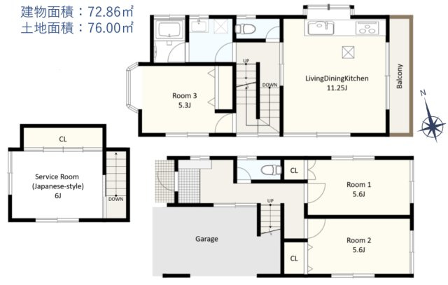 洋室 5.6帖 2室 / LDK 11.2帖 1室 / 洋室 5.3帖 1室 / S(納戸) 6.0帖 1室 / |