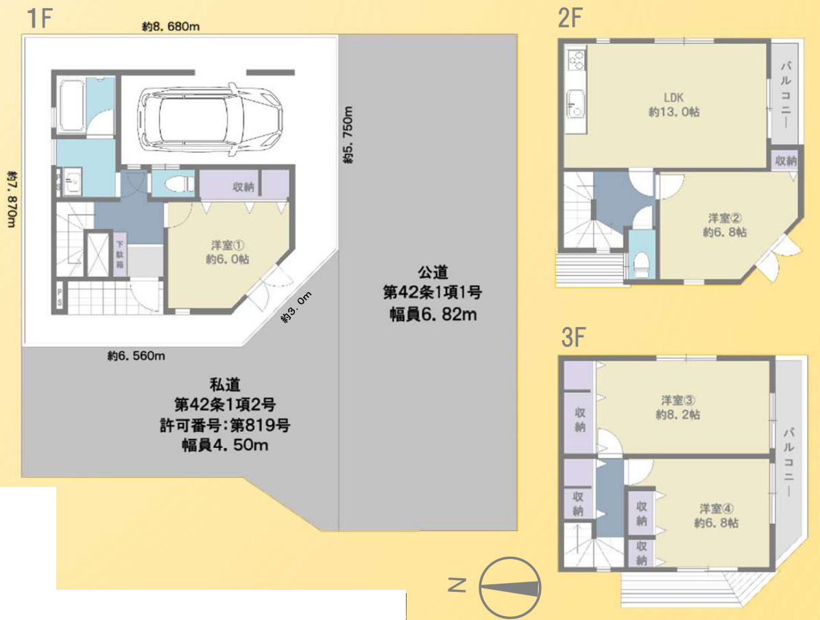 | 接道状況 | 角地 (南側 公道6.8m 間口5.7m) (西側 私道4.5m 間口9.5m) | ||